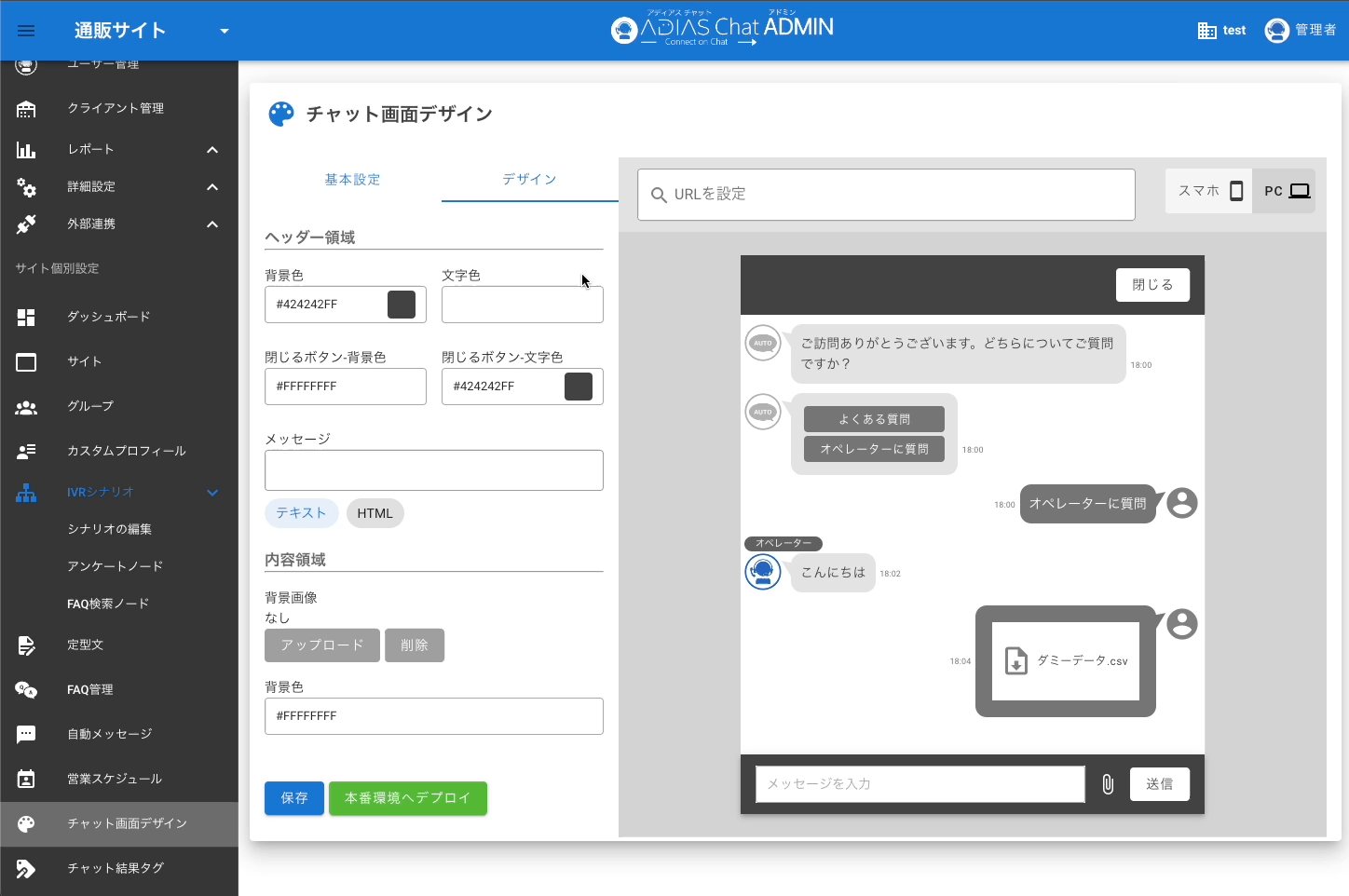 テスト画面更新ボタンで、チャットプレビュー画面の更新ができます。