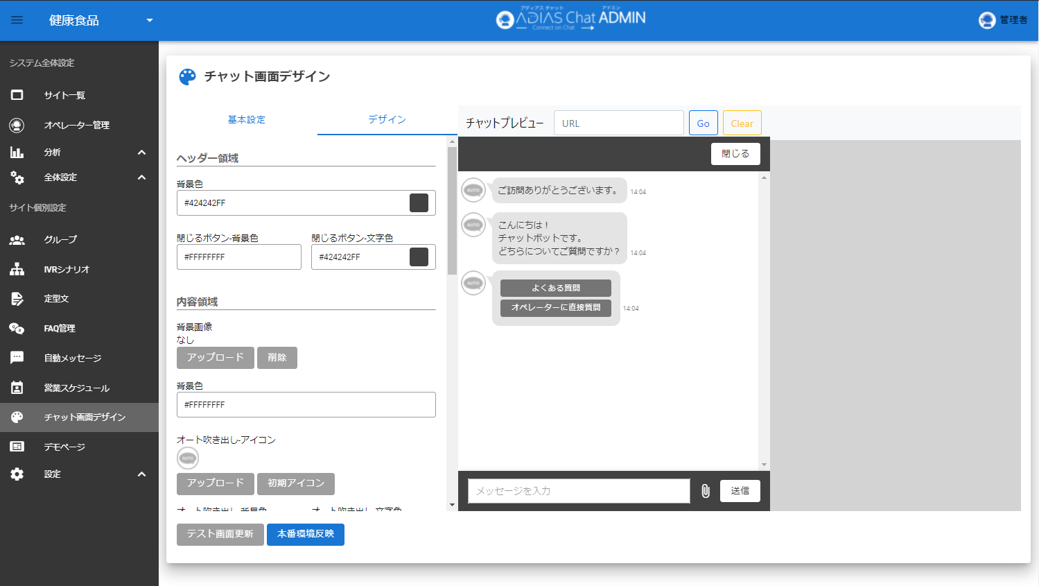 テスト画面更新ボタンで、チャットプレビュー画面の更新ができます。