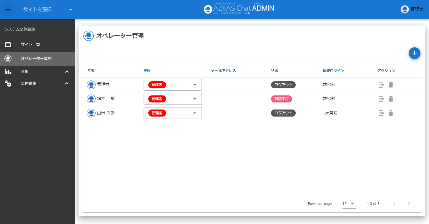 On this pageオペレーターの同時接続数の上限に達してログインできない意図せずオペレーターがログイン状態になっている等でオペレーター同時接続数の上限に達した場合、管理者は該当オペレーターを強制的にログアウトさせることができます。オペレーター管理#サイドメニューよりオペレーター管理をクリックして移動します。強制ログアウト#オペレーター管理画面のアクション項目より、ボタンを押すことで、任意のオペレーターをログアウトさせることができます。noteオペレーターの同時ログイン数は契約によってことなります。