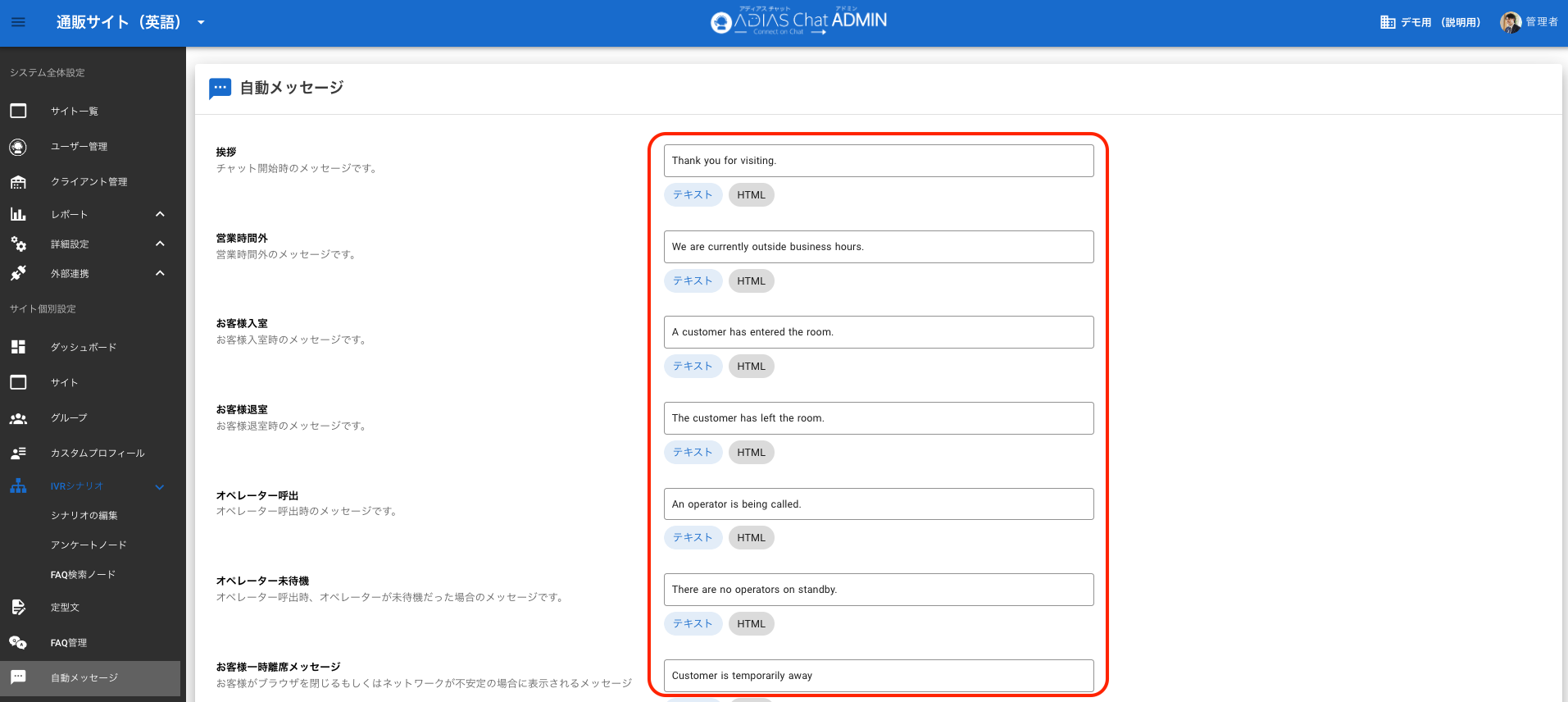 最後に特定のタイミングで自動的に表示されるメッセージを外国語に変更します。