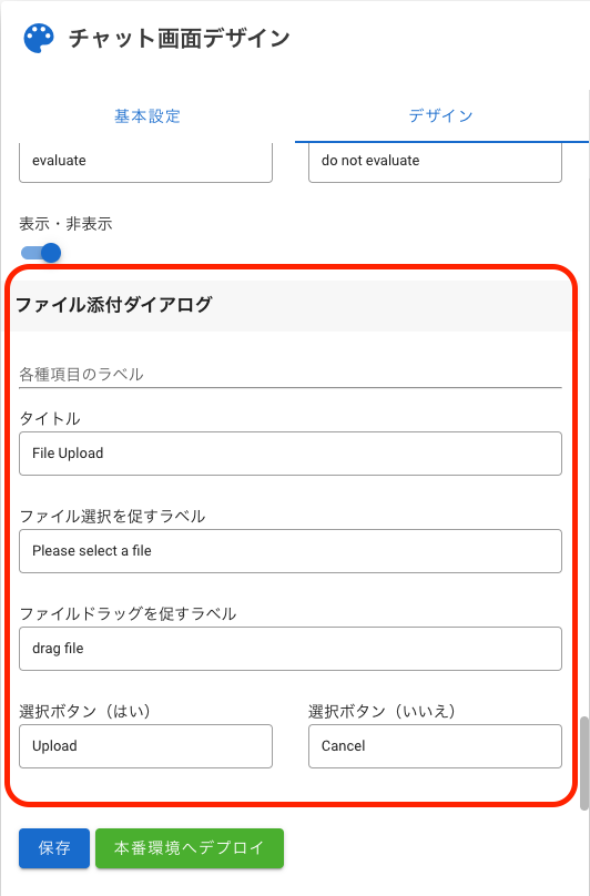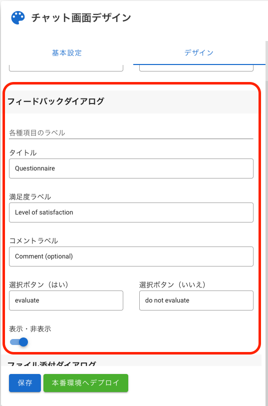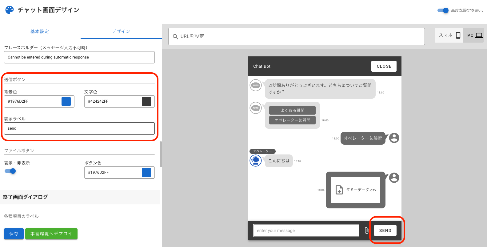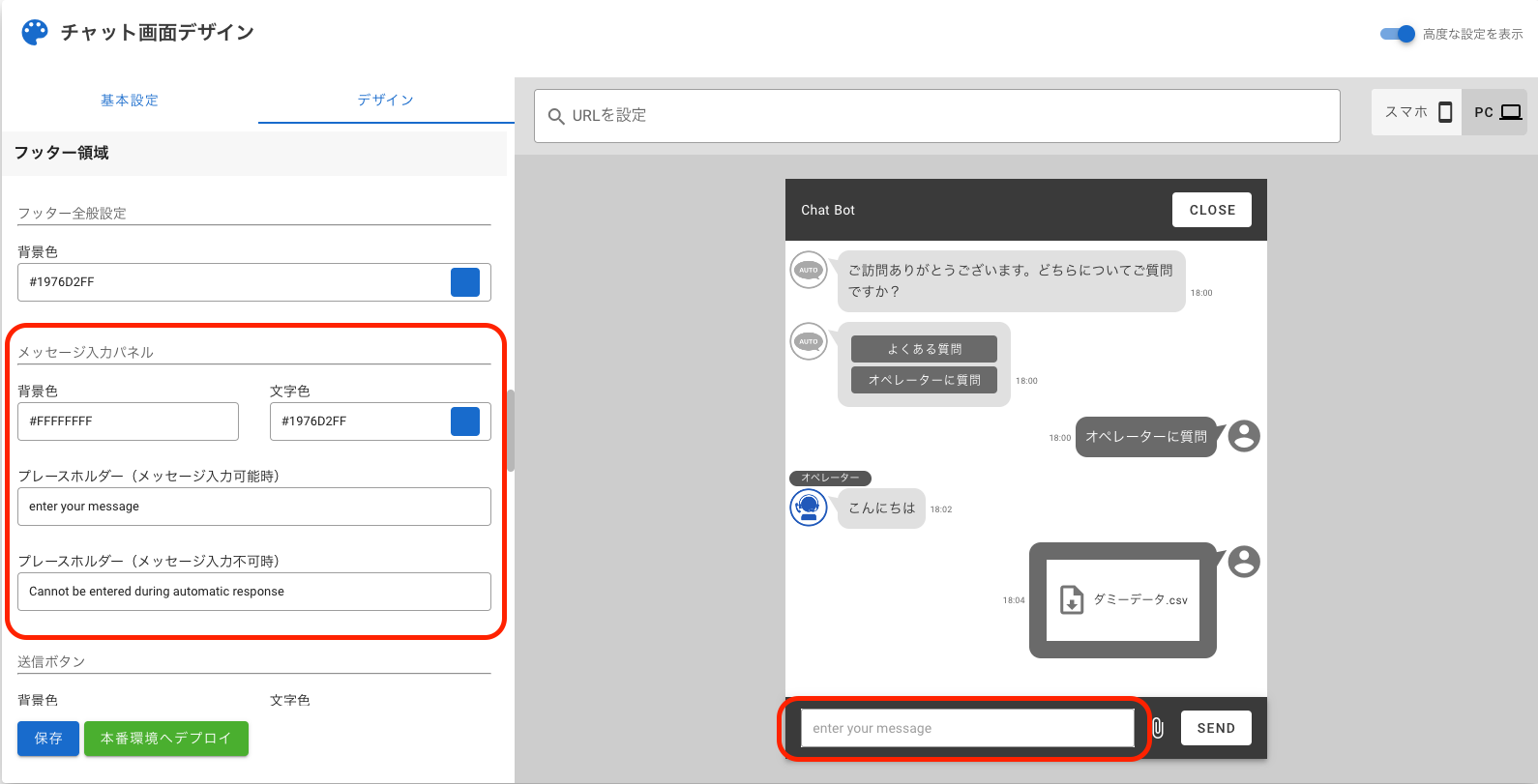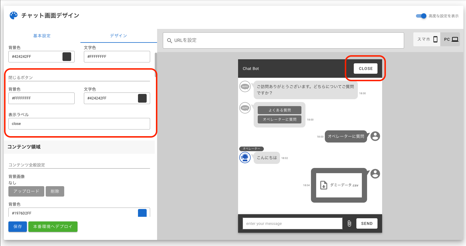 チャット画面デザインページの右上の「高度な設定の表示」をオンに変更します。