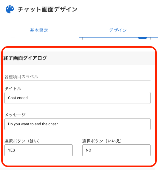 終了画面ダイアログの各項目を外国語へ変更します。 終了画面ダイアログはチャット右上の終了ボタンをクリックしてチャットを終了する際に表示される確認ダイアログです。