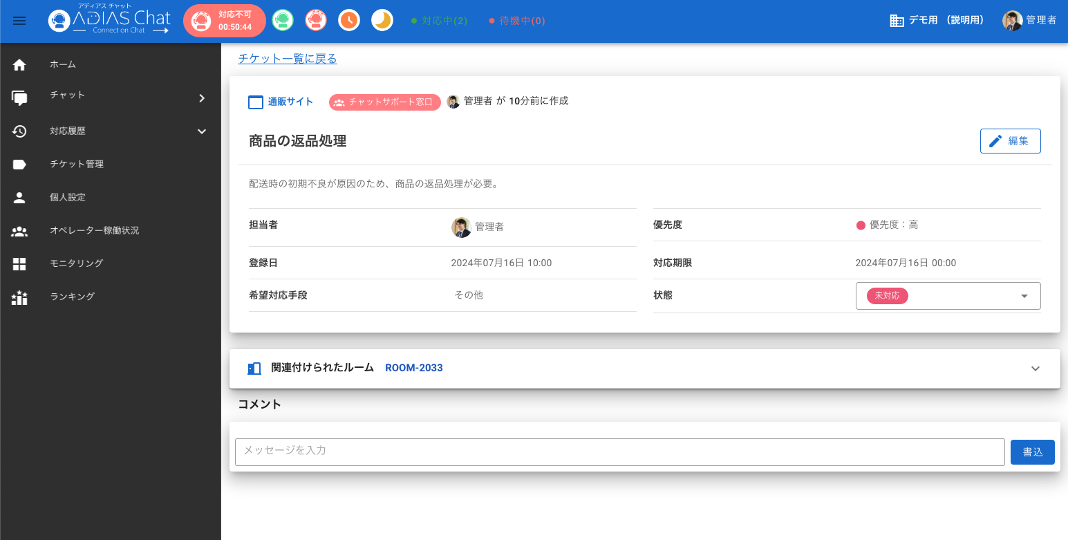 チケット一覧からデータをクリックすると、チケットの詳細を確認することができます。