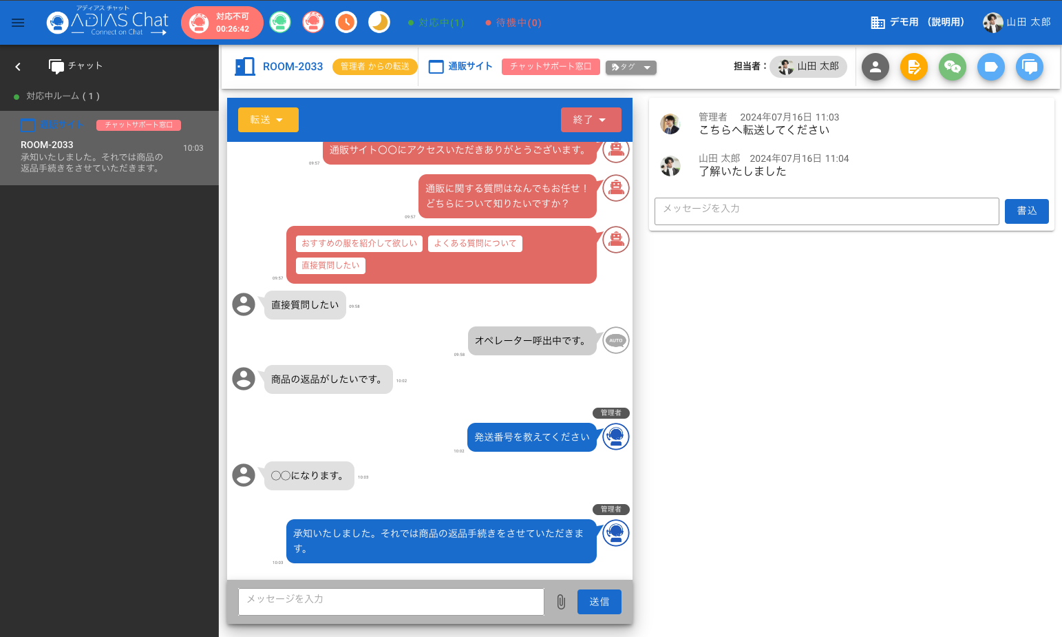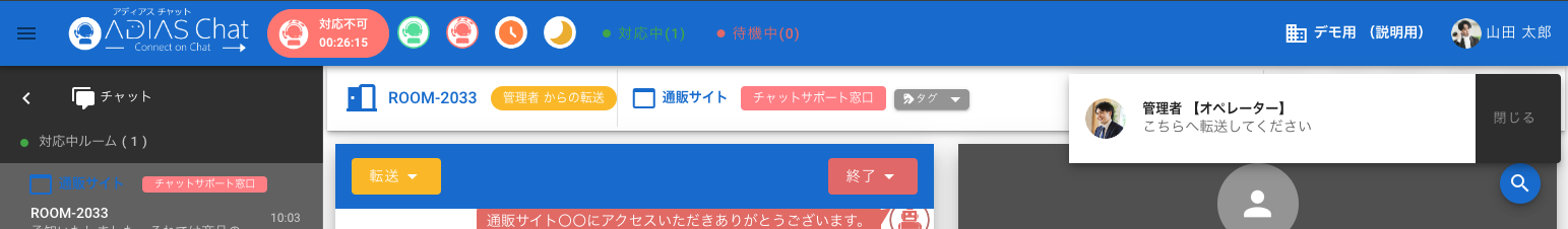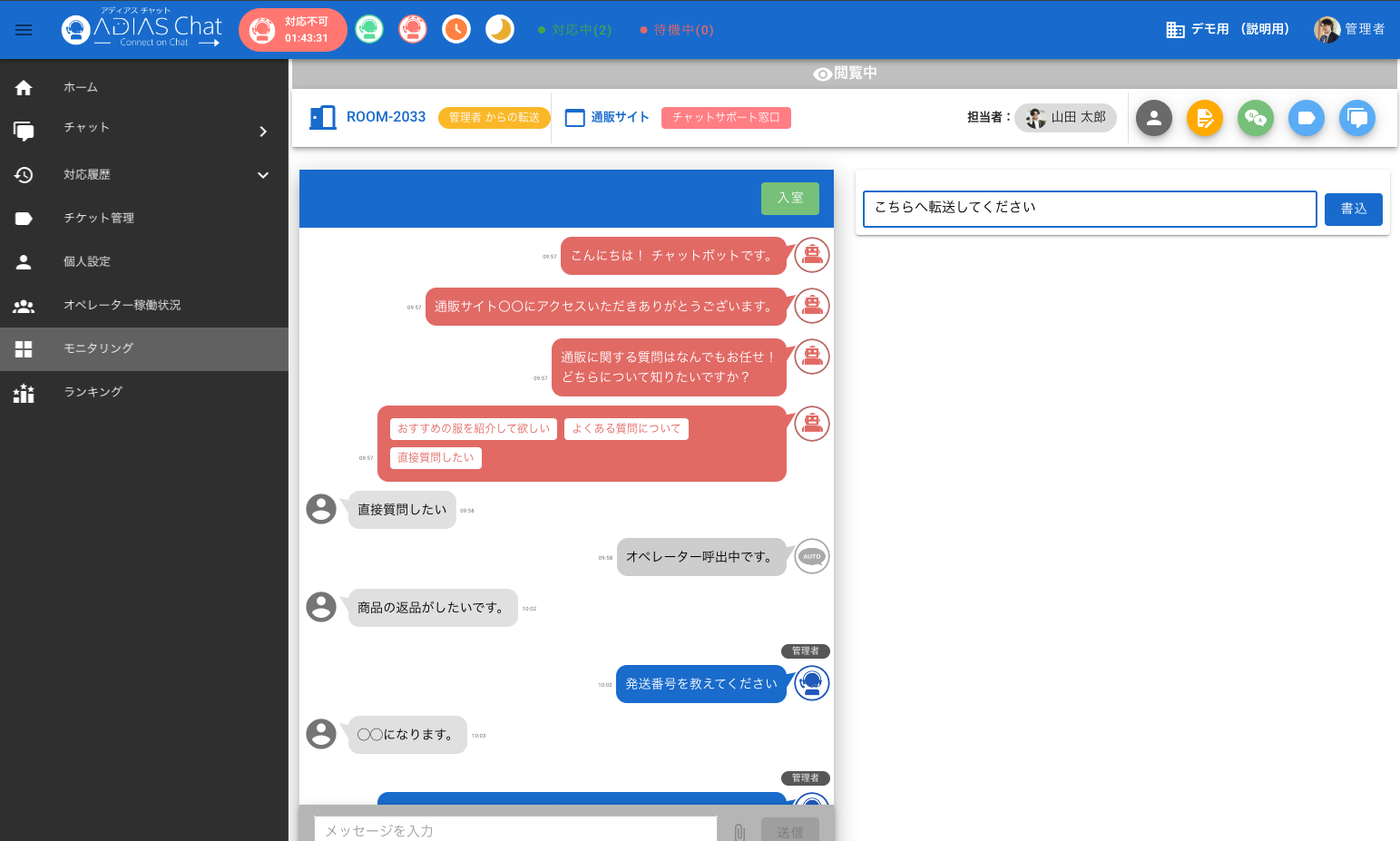 メッセージの履歴に先ほどのメッセージが表示されるので必要に応じてオペレーター間でメッセージのやり取りを行います。