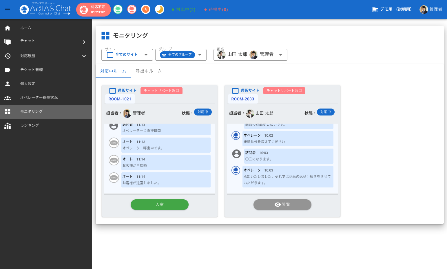 スーパーバイザーは他のオペレーターが対応しているルームをリアルタイムにモニタリングすることができます。