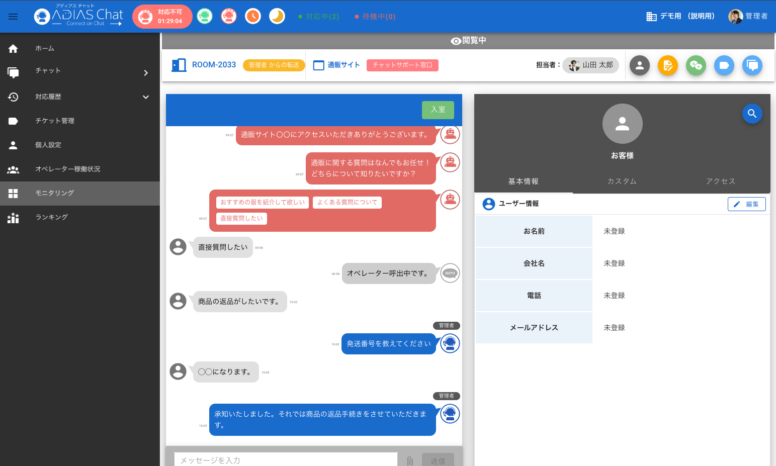 他のオペレーターがどのような返答をしているか監視することができるので適切な回答を促すことも可能です。